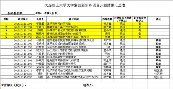 注,标黄的5个项目为推荐校级以上候选项目。教学事务部会组织专家对各学院(部)推荐的校级以上候选项目进行二次答辩,确定盘锦校区校级以上推荐项目(推荐项目数量为校区校级项目总数的25%)。学校大学生创新创业训练计划组织委员会将组织专家对推荐项目进行评选,从中评选出国家级、省级创新训练项目。